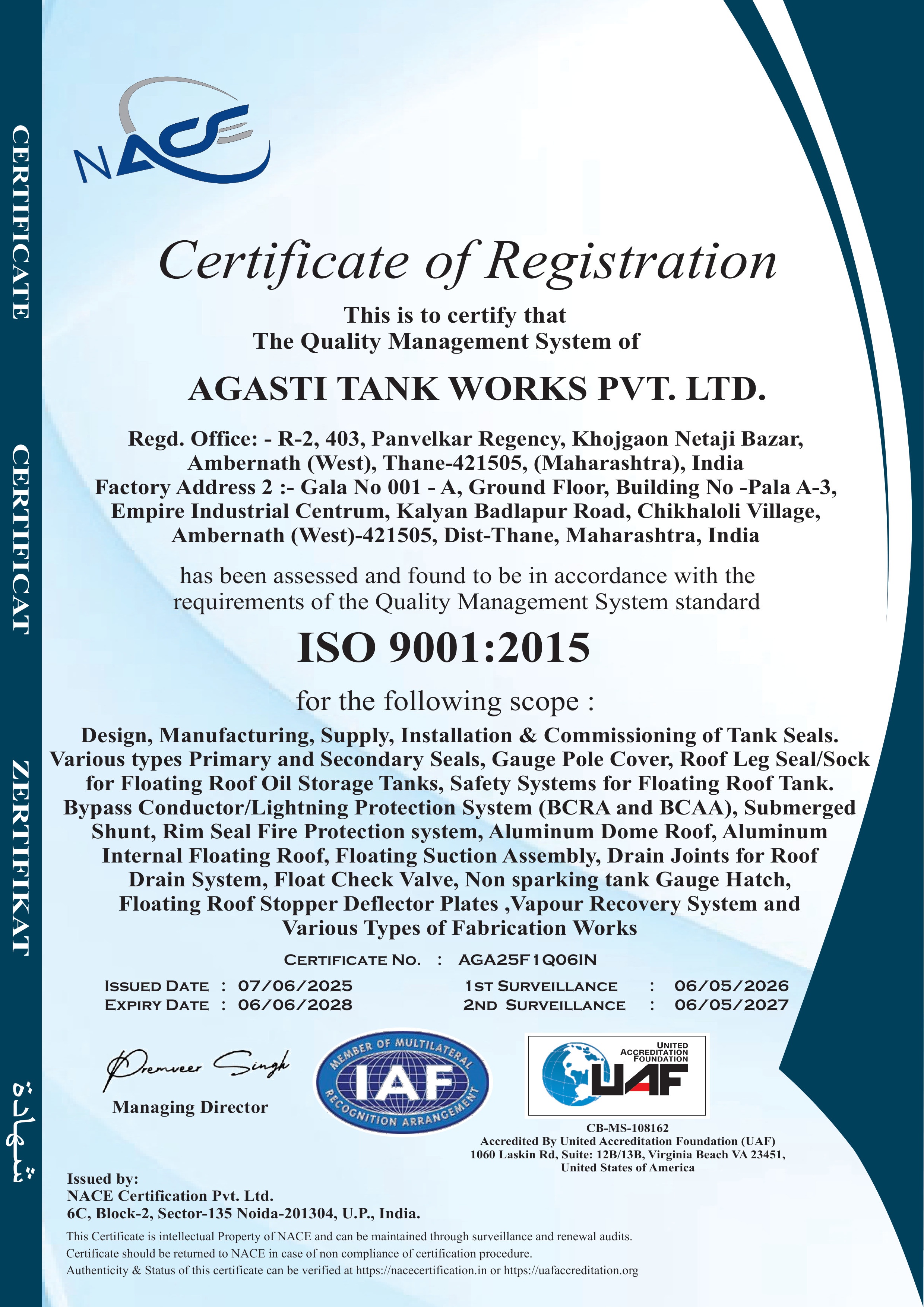 "At Agasti Tank Works Pvt Ltd, quality assurance is at the core of our operations. In every aspect of the design, engineering, manufacturing, installation, supervision, and inspection of vapour control and safety systems for floating roof oil storage tanks, we adhere to rigorous standards. Our commitment to excellence is reflected in the use of top-tier materials, cutting-edge technology, and skilled craftsmanship. We ensure that all systems are compliant with industry regulations and tailored to meet specific client needs, guaranteeing safety, reliability, and long-term performance in every project."